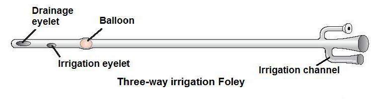 Three-way catheters are available with a third channel to facilitate continuous bladder irrigation.