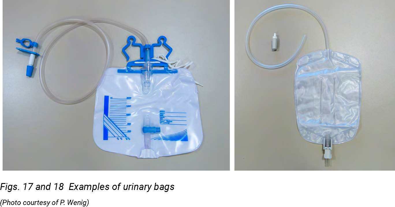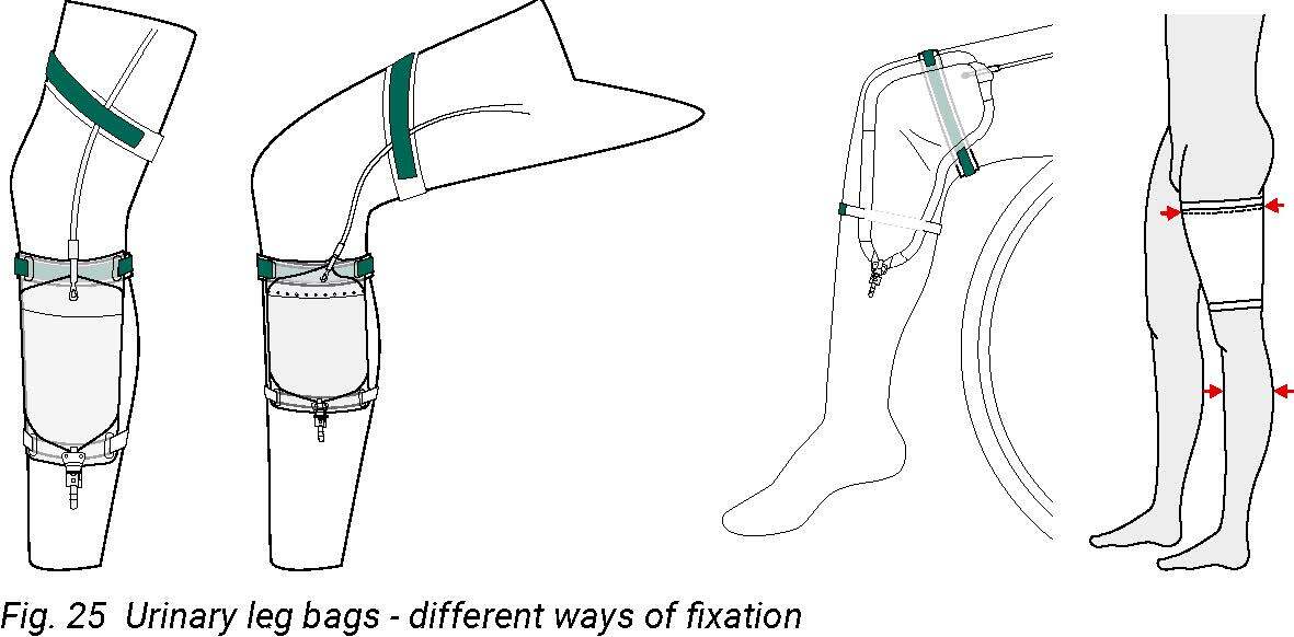 Leg bags are available in different sizes (120–1000 ml), designs and qualities and it is important to select a bag and a bag length according to the patient’s preference and mobility and the intended duration of use. (Fig. 22)