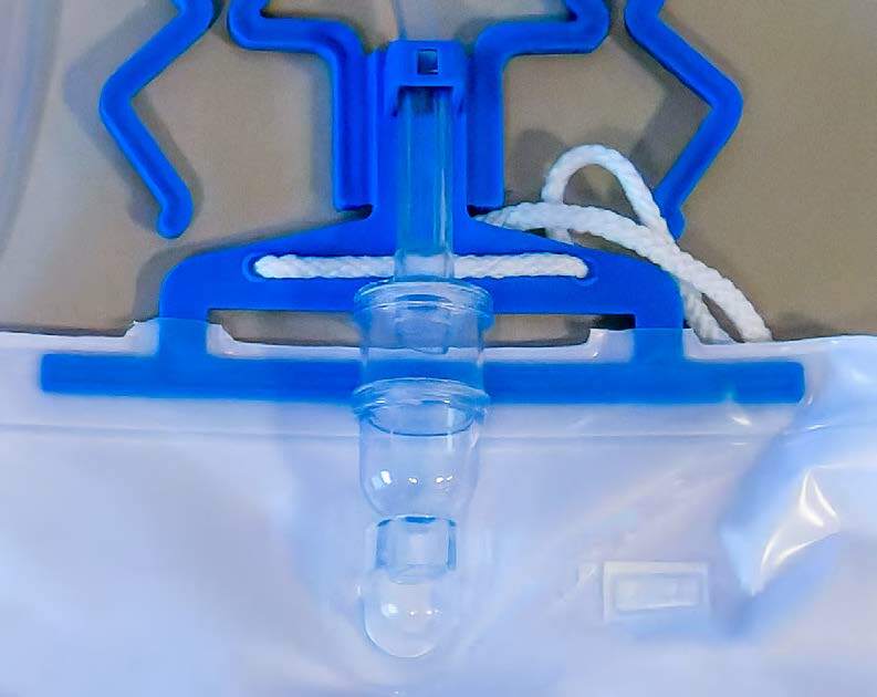 (Please note that the bag is being held above the level of the bladder for photographic purposes only)