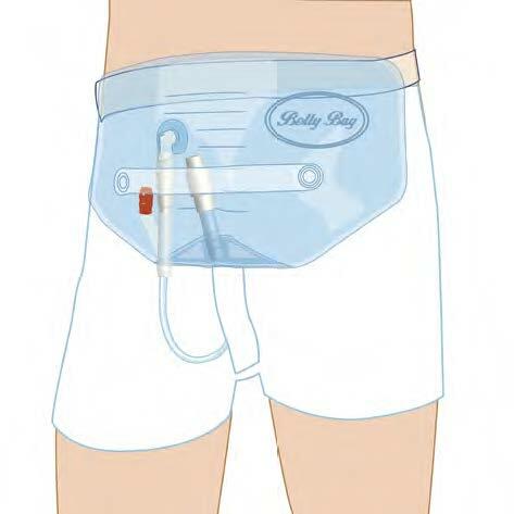 Another discreet bag that allows mobility is the body-worn bag; e.g., the Belly Bag® (Fig. 23). The bag can be used with either a suprapubic, urethral or nephrostomy catheter, but is not intended to be used with a male external catheter (condom or urosheath) in men. An anti-reflux valve behind the catheter port prevents reflux urine flow, which allows positioning of the bag above the level of the bladder, contrary to other bags. It is not intended to be used permanently, but for short-term use; e.g., during sports or when visiting a sauna.