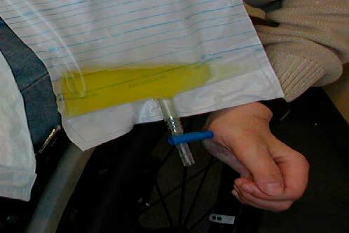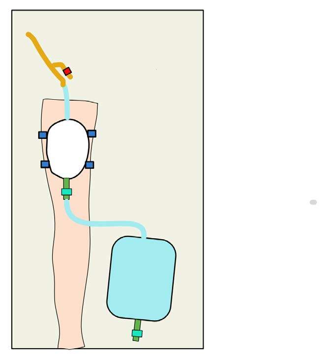 The outlet tap on the leg bag is left open so that the urine collects in the larger bag without breaking the closed drainage system. [57] (Fig. 28)