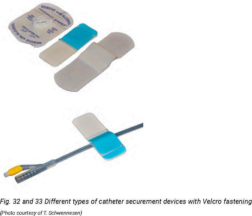 Catheter securement devices are designed to prevent excessive traction of the catheter against the bladder neck or inadvertent catheter removal. There are different kinds of securement devices such as tape, Velcro™. (Figs. 32, 33)