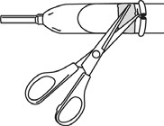 | If necessary, to avoid pressure marks or if the penis retracts during micturition (emptying the bladder), the remaining rubber ring behind the adhering area can be removed by cutting or tearing the rim while the MEC remains adhered. [8,43] | Be careful that the skin is not damaged (special scissors are available). Fig. 54. Cut the rim ![]() |