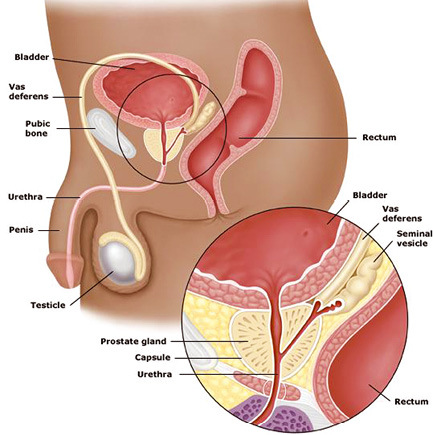 The prostate is an extraperitoneal structure, lying anterior to the rectum and at the bladder neck. The prostate encircles the urethra and it empties its secretions into the urethra. It comprises a number of smaller glands that are surrounded by smooth muscle and connective tissue. During ejaculation the smooth muscle contracts and compresses the glands, forcing secretions into the urethra. Prostatic secretions contain several enzymes including PSA that help to liquefy semen by breaking down coagulation factors plus citrate, which the sperm uses for energy.