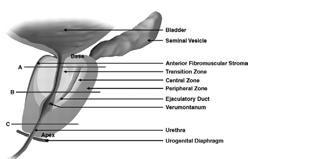 Fig. 3 Gross anatomy – prostate ((sagittal) - A base, B mid, C apex of gland