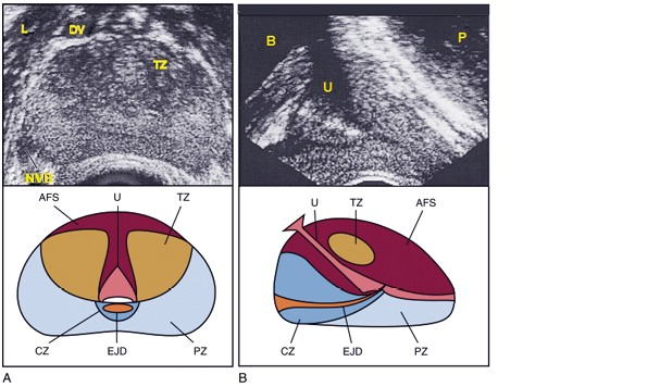 Normal prostate ultrasound images (top) with diagrams (bottom) at approximately the level of the verumontanum demonstrating zonal anatomy. A, Transverse view. B, Sagittal view. AFS, anterior fibromuscular stroma; CZ, central zone; DV, dorsal vascular complex; EJD, ejaculatory ducts; NVB, neurovascular bundle; L, levator muscles; PZ, peripheral zone; TZ, transition zone; U, urethra.