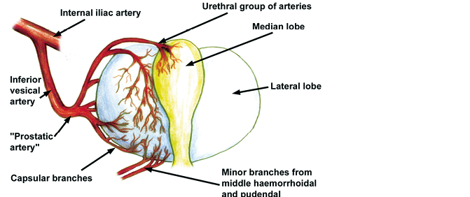 The prostate has a rich arterial blood supply. The prostate artery is a branch from the inferior vesical artery (Fig. 6), a branch of the internal iliac artery, which divides into capsular and urethral arteries. Branches of the inferior vesical artery supply the seminal vesicles and occasionally the base of the gland. Santorini’s venous plexus lies anteriorly and has small perforating vessels into the prostate. The neurovascular bundles lie postero-laterally at 5 and 7 o’clock and contain the branch arteries, veins and nerves that go to the penis and urethral sphincter.