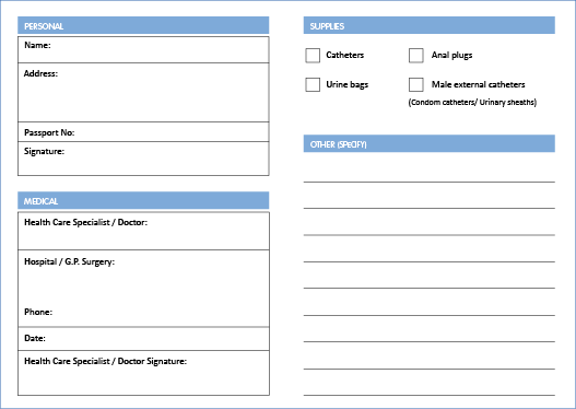 • Availability of appropriate aids to help with catheterisation such as mirrors, hand grips, leg abductors, integrated drainage bags, and travel kits