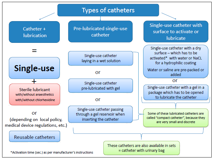 Several types of catheters and sets are available for IC. Diagram 3 gives an overview of the existing types. The catheters illustrated in this document are examples only, and not exhaustive.