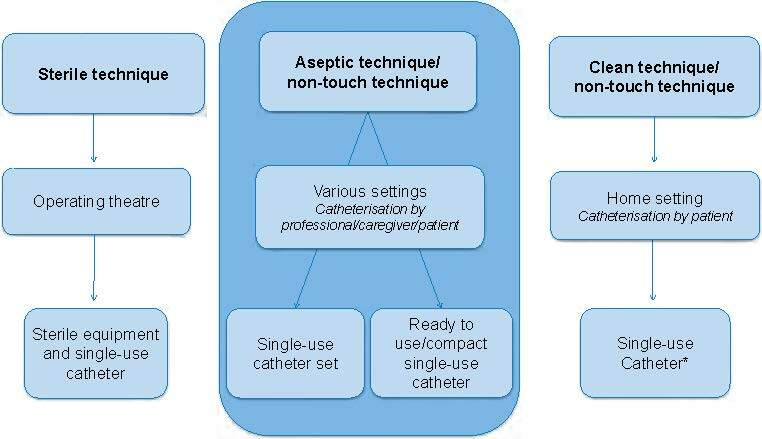 The choice of technique depends on the setting where intermittent catheterisation (IC) takes place, who performs the catheterisation, and the local policy of the different countries (see Diagram 5). In hospital settings, there are rising concerns about infection control, indicating that sterile technique is needed. [24]